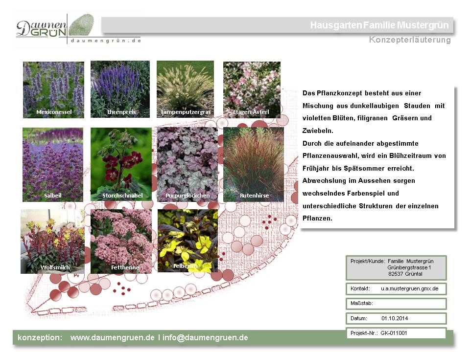 Die zugehörige Konzepterläuterung beschreibt den Charakter der Pflanzung, Angaben zum Standort, spezifische Eigenschaften der Pflanzen und Bildmaterial.