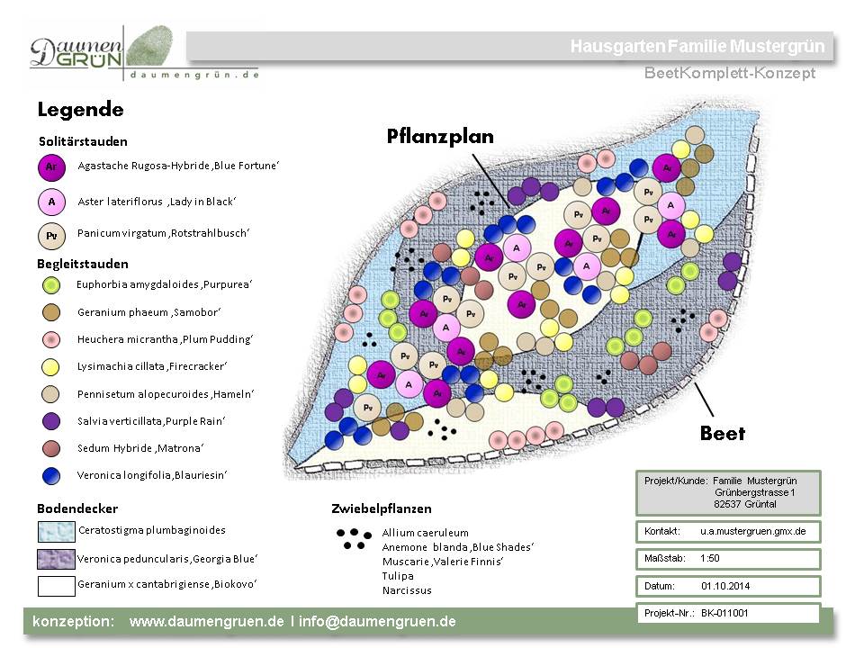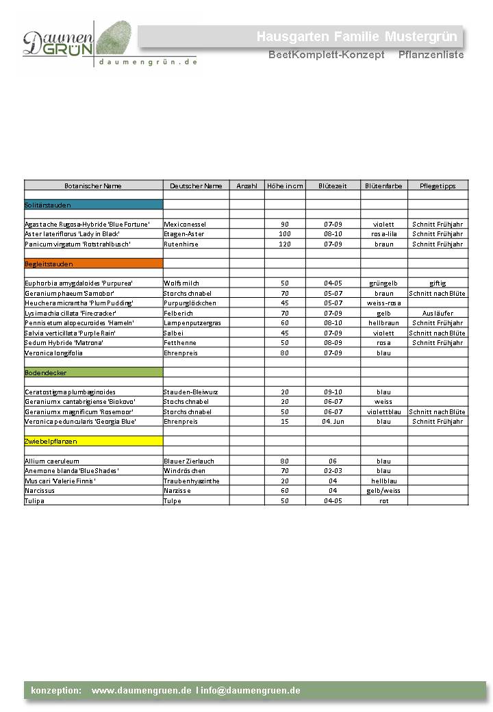 Durch die ausführliche Pflanzenliste, erhalten Sie einen Überblick über alle vorgeschlagenen Pflanzen mit deutscher und botanischer Bezeichnung. Angaben zur Anzahl , Höhe, Blütezeit und spezifischen Pflegehinweisen.